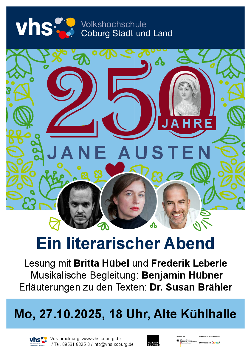 Eintrag vom: 13.10.2025 16:49 UhrIm Jahr 2025 feiern wir das 250-jährige Jubiläum von Jane Austen, einer der bedeutendsten Schriftstellerinnen der englischen Literatur. Ihre Werke haben nicht nur die Literatur geprägt, sondern auch einen tiefgreifenden Einfluss auf die Wahrnehmung der Frauenrolle in der Gesellschaft genommen. In einer Zeit, in der die Gleichstellung der Geschlechter nach wie vor ein zentrales Thema ist, bleibt Austens Botschaft relevant: Die Suche nach Identität, Liebe und Unabhängigkeit ist universell und zeitlos. Insgesamt hat Jane Austen nicht nur die Literatur bereichert, sondern auch einen bedeutenden Beitrag zur Diskussion über die Rolle der Frauen in der Gesellschaft geleistet. Diese Diskussion will die Volkshochschule Coburg in Kooperation mit Making Culture in der Abendveranstaltung „250 Jahre Jane Austen“ am 27.10.2025 weiterführen. An diesem Abend in der alten Kühlhalle lesen die Schauspieler Britta Hübel und Frederik Leberle Texte zu diesen Themen aus Austens Werken. Die Beiträge werden visuell und musikalisch von Benjamin Hübner untermalt. Dr. Susan Brähler wird zwischen den Texten Erläuterungen geben. Zudem wird sie Fragen stellen, die zur Diskussion anregen. Die Veranstaltung wird vom Bundesprogramm Demokratie leben! gefördert.