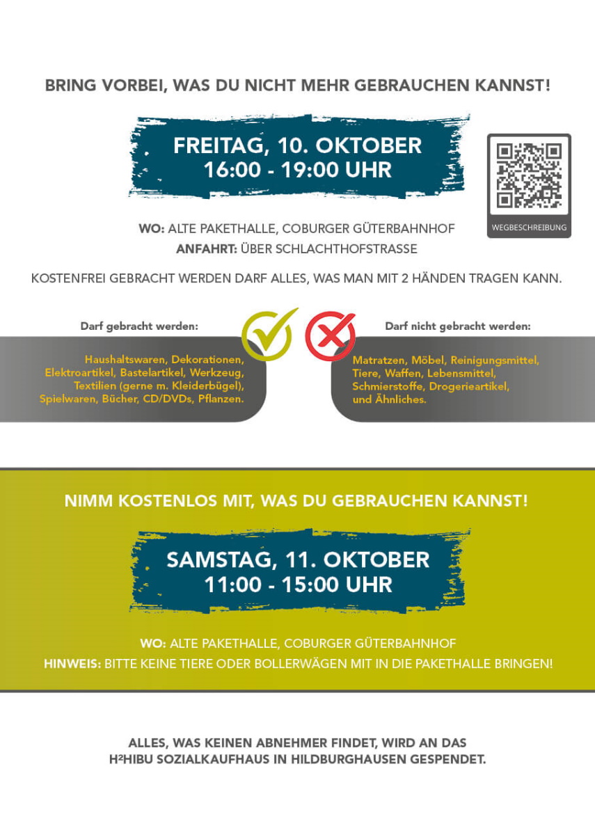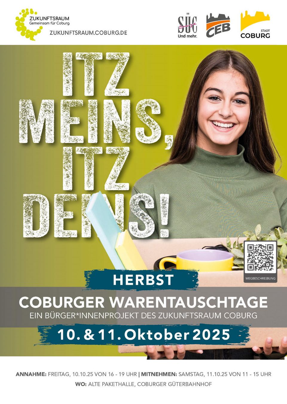 Wir laden euch herzlich ein, am Samstag, 11. Oktober, beim 5. Coburger Warentauschtag "Itz Meins, Itz Deins!" dabei zu sein! Gut erhaltene Waren zum Tauschen könnt ihr bereits am Vortag abgeben.