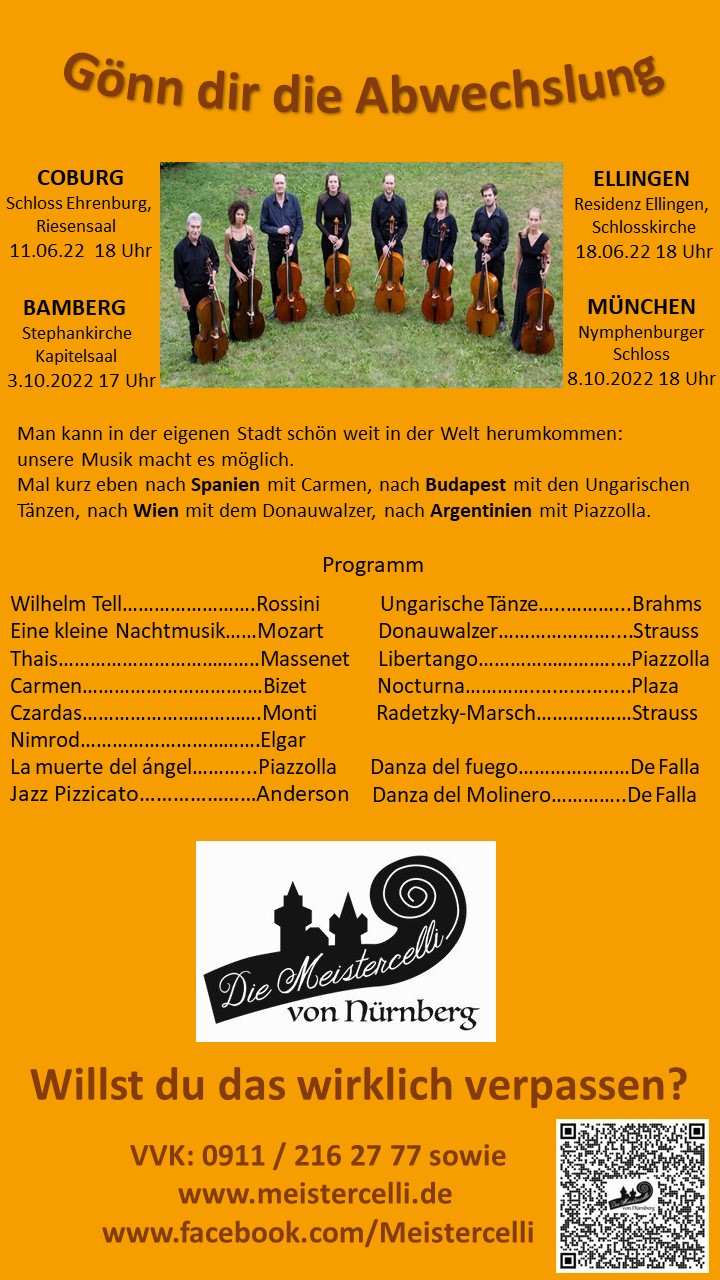 Mit einem breit gefächerten Programm kommen die hochkarätigen Nürnberger Cellist*innen nach Coburg. Die Meistercelli von Nürnberg konzertieren im Riesensaal von Schloss Ehrenburg und spielen Werke von Rossini, Massenet, Piazzolla, Brahms, Strauss oder De Falla.