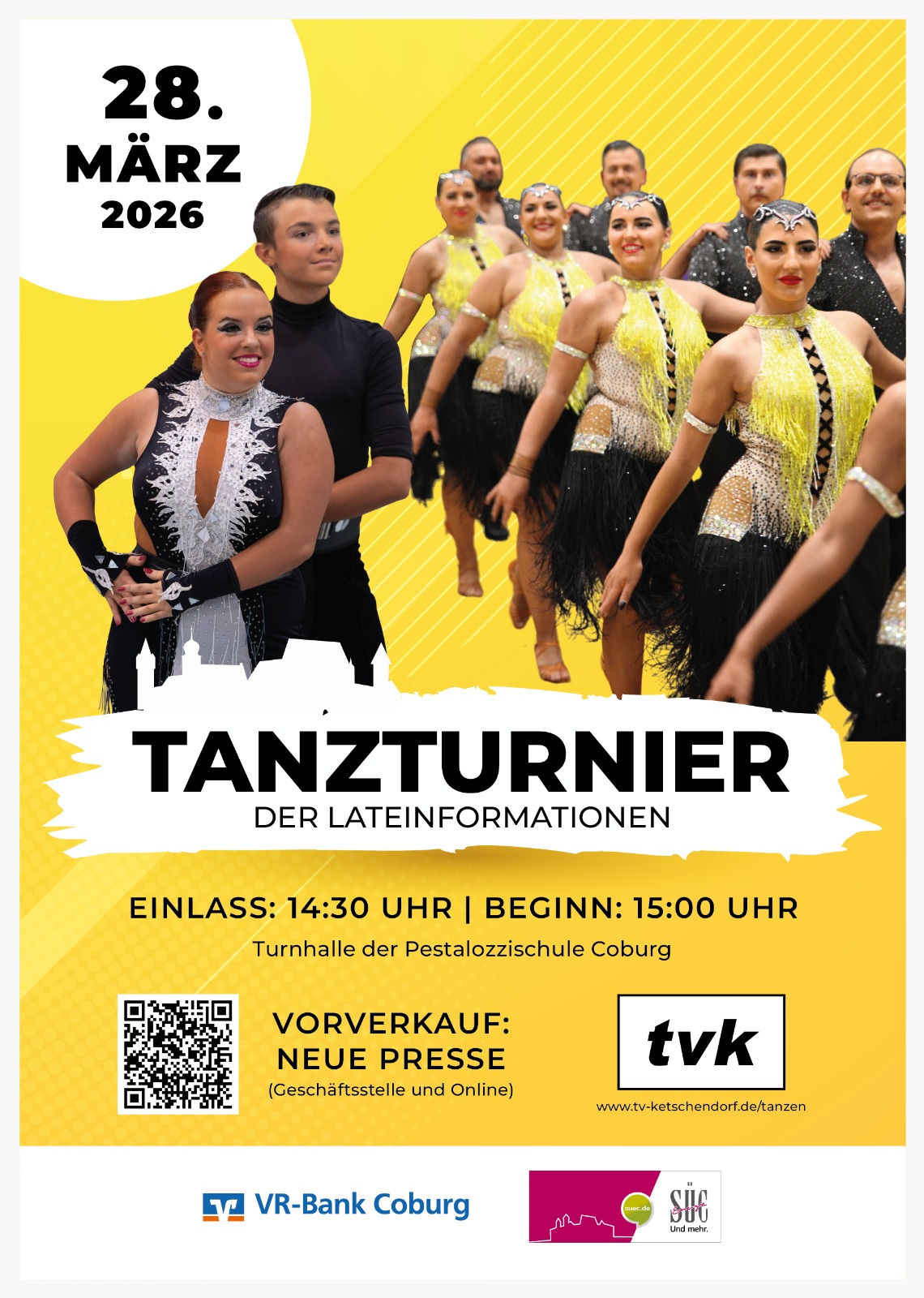 Auch 2026 darf sich das Coburger Publikum auf ein Tanzturnier der Lateinformationen freuen, das zugleich das Saisonfinale der Landesliga und Regionalliga Süd Bayern ist. Für Coburg gehen am 28. März in der Turnhalle der Pestalozzischule insgesamt vier Mannschaften an den Start. Das A-Team der Erwachsenen und die Jugend-Turniermannschaft (B-Team) starten in der Landesliga, wo sie auf Mannschaften aus München, Nürnberg, Weiden und Zürich treffen. Die neu gegründete Freizeitformation bestreitet in der Hobbyliga ihr erstes Turnier. Dort treten auch die 8-12jährigen TVK Dance Kids an. Außerdem kämpfen in der Regionalliga Teams aus Wasserburg, München, Nürnberg, Zürich, Altenburg um den Aufstieg in die 2. Bundesliga. Damit ist ein spannender Turniertag mit sportlichen Höchstleistungen und emotionalen Momenten garantiert.
